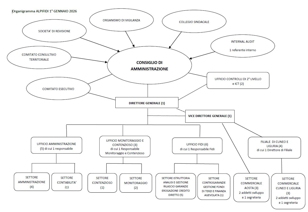 Alpifidi S.c. è articolata in unità organizzative/Uffici che riportano alla Direzione Generale e alla Vice Direzione Generale Generale